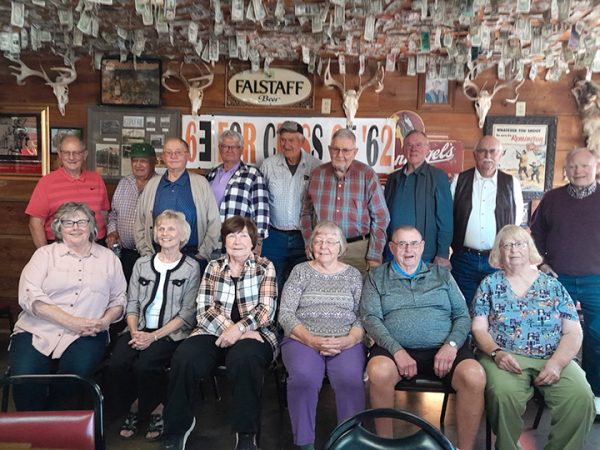 Front row: Nancy Koss Heathman, Marianne Sovers Harney, Lou Steinbrech Ulch, Rosie Peer Fisher, Ed Osborn, and Darlene Kabela Brant Back row: Barry Beuter, Don Kabela, Bill Miller, Larry Leonard, Jim Fencl, Joe Miller, Bill Gleason, Mark Heathman, and Larry Tellin